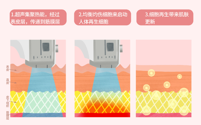 热量达到SMAS层后,可有效刺激纤维母细胞以每秒40倍速分裂新生细胞,溶解面部脂肪细胞、修复受损纤维组织、诱发胶原蛋白大量新生和重组,从深层到表层提升皮肤质量,对松弛皮肤进行提拉、紧致、塑形,从而达到逆转肌龄的效果。