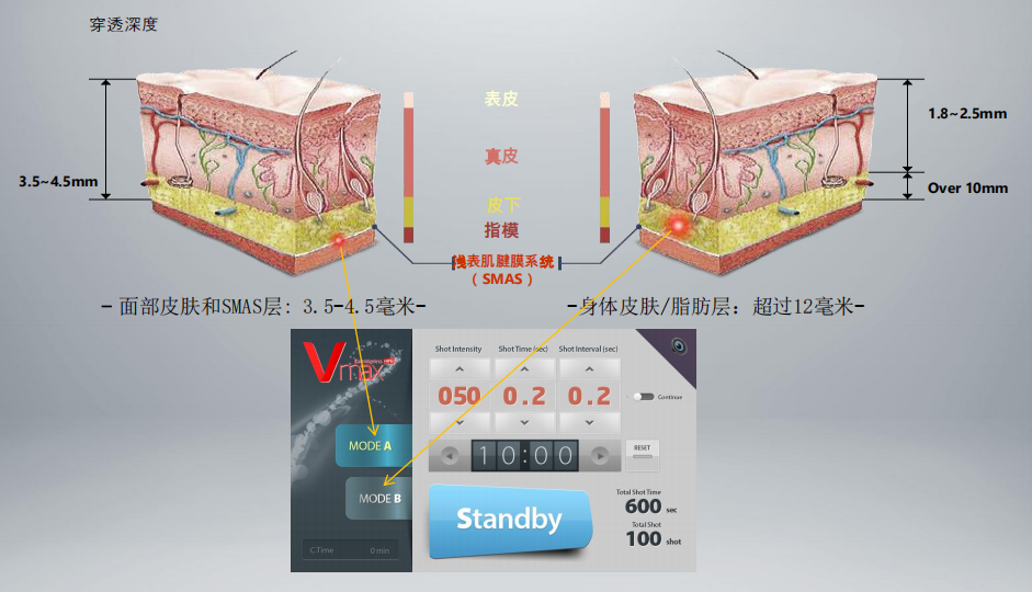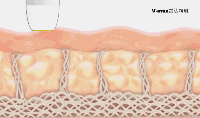 V-Max雷达精雕,运用先进的雷达追踪定位系统结合高强度的超声波聚焦技术,利用机械雷达波良好的组织穿透性,精准的将能量作用于SMAS筋膜层(约为3.5mm~4.5mm)和脂肪层(深度10mm~20mm )。