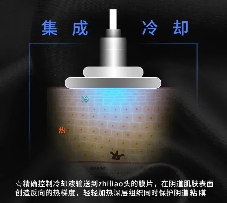 2、集成的冷却,精确控制冷却液输送到治疗头的膜片,在阴道肌肤表面创造反向的热梯度, 轻轻加热深层组织同时保护阴道粘膜。