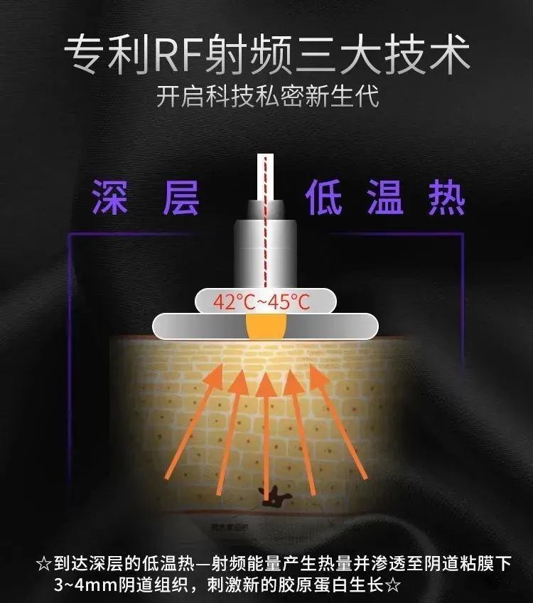 1、到达深层的低温热--射频能量产生热量并渗透至阴道粘膜下 3-5mm 阴道组织,刺激新的 胶原蛋白的生长