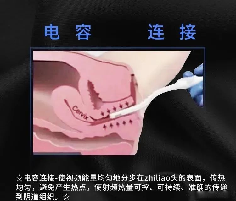 3、电容连结-使视频能量均匀地分布在治疗头的表面,传热均匀,避免产生热点,使射频热 量可控制、可持续地准确传递到阴道组织。