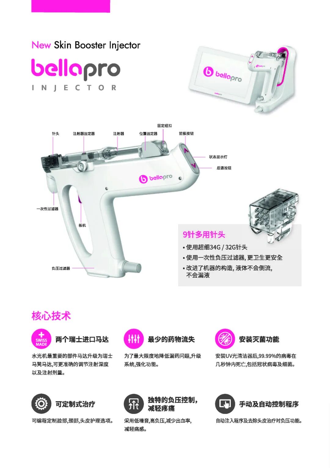 bellavita、bellapro采用0针多用针头:两个瑞士进口马达、安装UV光清洁器后,99.99%的bingdu在几秒钟内死亡,包括guanzhuangbingdu及xijun。