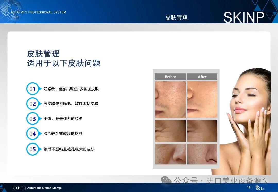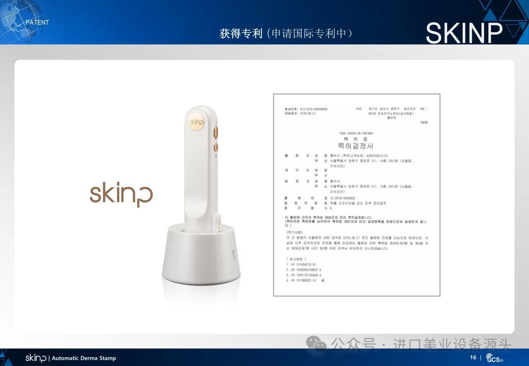 01 | 符合人体工学的握柄和高档的设计02 | 使用灭菌处理过的一次性针03 | 使用微针同时直接渗透有效成分04 | 使用660nm波长的红光 led05 | 连接主机和充电底座时可自动消毒06 | 精密的微针排列可以更均匀的触及到皮肤表面07 | 各阶段速度可调整(1~3阶段)08 | 短时间内可触及范围广缩短使用时间09 | 使用了齿轮式电动机垂直运作功率强且使用寿命长10 | 获得了诱导有效成分吸收领域的国际专利
