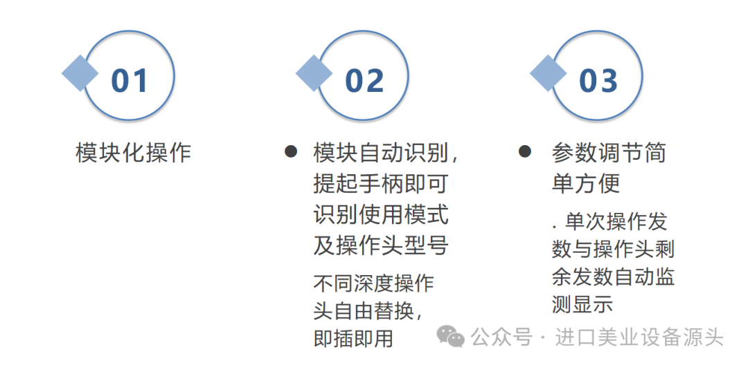 1.M3.0治疗头代表作用深度是3.0mm,也就是我们的真皮深层和皮下脂肪层。2.M4.5治疗头代表作用深度是4.5mm,也就是我们的SMAS筋膜层。3.炮手具有4.5mm、3.0mm、2.0mm三个深度。可以扫描滑动治疗,圆形的设计能覆盖到面部和颈部的治疗细节,滑动累积加热的方式弥补了定点操作时的禁区。4.D2.0治疗头代表作用深度是2.0mm,也就是我们的真皮深层。5.D3.0治疗头代表作用深度是3.0mm,也就是我们的皮下脂肪层。6.D4.5治疗头代表作用深度是4.5mm,也就是我们的SMAS筋膜层。仪器优势:
