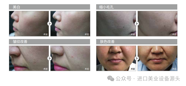 适用人群:毛孔粗大、痘印痘坑、肤色暗沉粗糙、皮肤松弛、有细纹干纹。仪器原理:运用非烫伤技术,利用网状射频能量加热组织,射频能量可直达肌底,激活自身胶原修复系统,促进胶原再生,为肌底建起网状支架,承托起松弛下垂的肌肤,使肌肤恢复紧实、弹性饱满、抚平皱纹、改善色素及细致毛孔等。仪器优势:韩国原装进口、安全性高、能量层面精准,结合了点阵激光的表皮剥脱与射频的真皮再生的双重功效,零结痴或者浅结痴、避免了修复期长以及留色沉等术后并发症,操作手法简单,操作风险小,且易复制,对表皮及真皮问题改善效果明显。